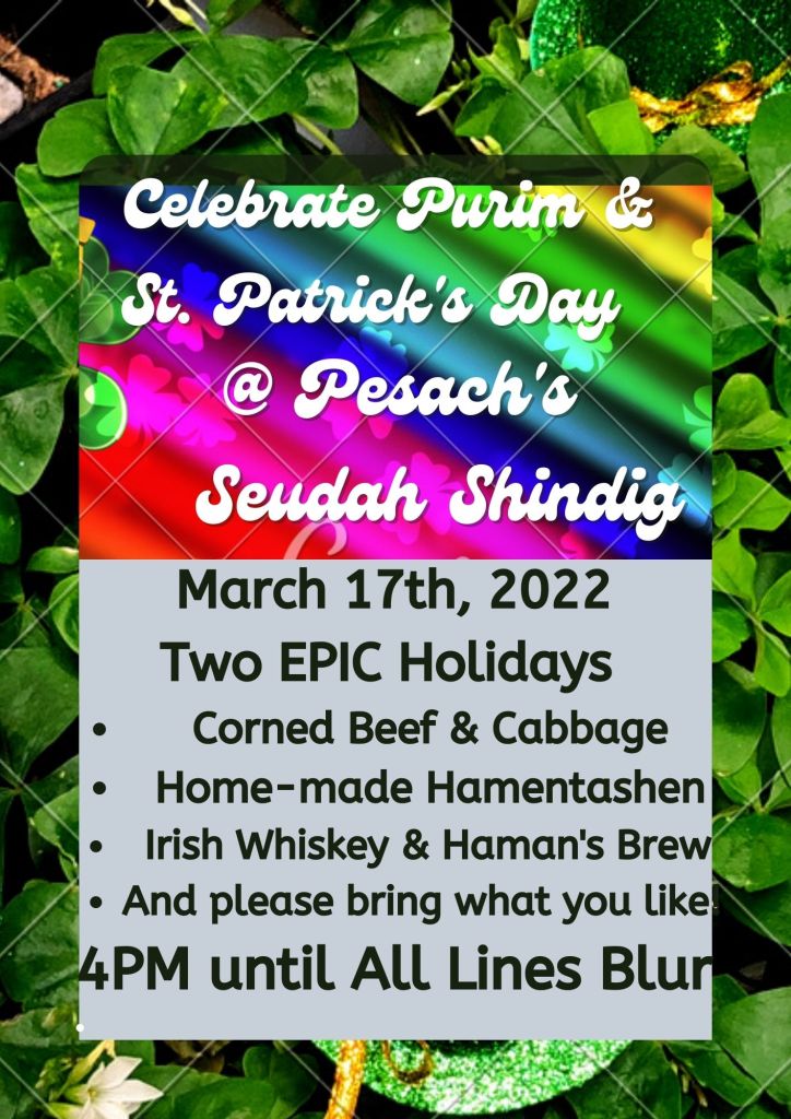 Following the call of a participatory approach to religious observance, I decided to throw a feast in honor of both Purim and St. Patty’s Day. I prepared 30 home-made hamentashen, a crock-pot of corned beef and cabbage, and a variety of libations. In the spirit of also observing a Jerusalem or Shushan Purim, I continued celebrating for another few days. I decorated my living room in the spirit of the festivities, all while simultaneously packing for an interstate move just two weeks away! I wanted to see our friends before we left, so I sent this “seudah shindig” flyer to about 40 people: